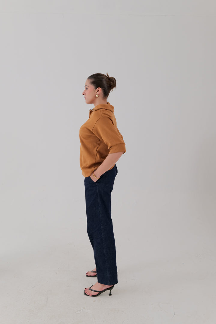 A denim pant in a bootcut style, featuring double-stitch panel detailing for structure. Designed with side pockets, back pockets, and a clean waistband for a timeless finish.