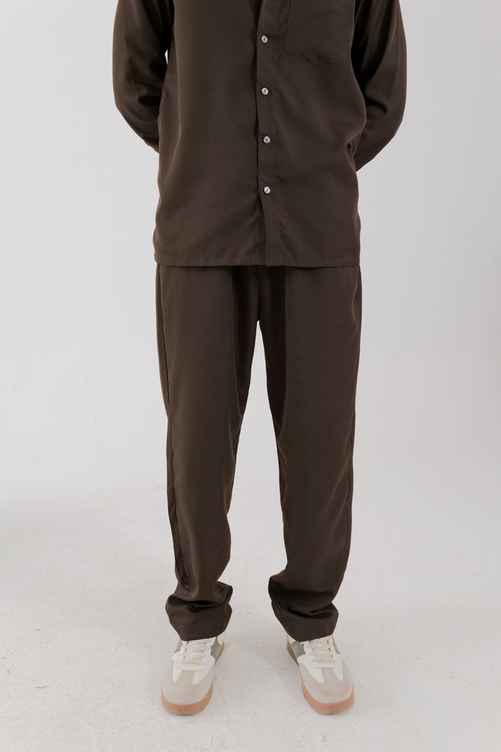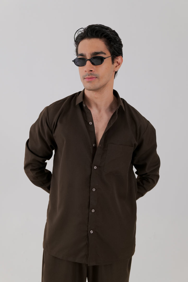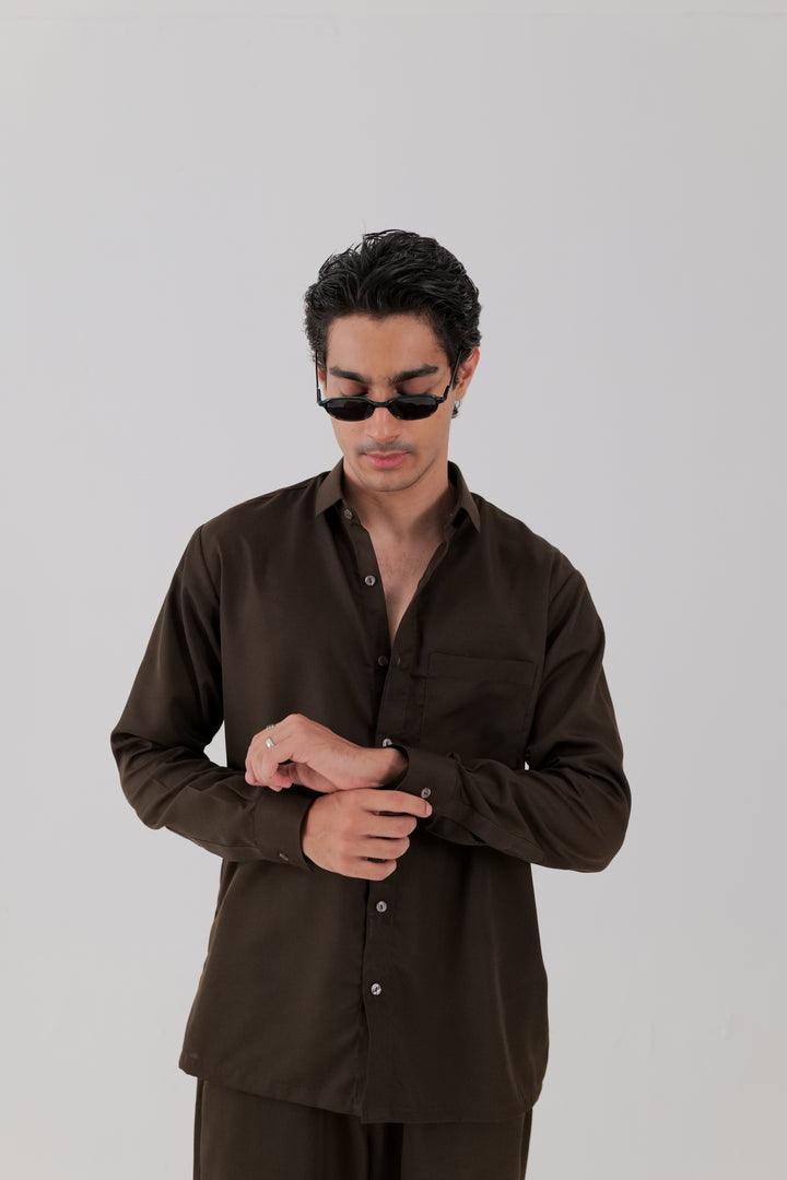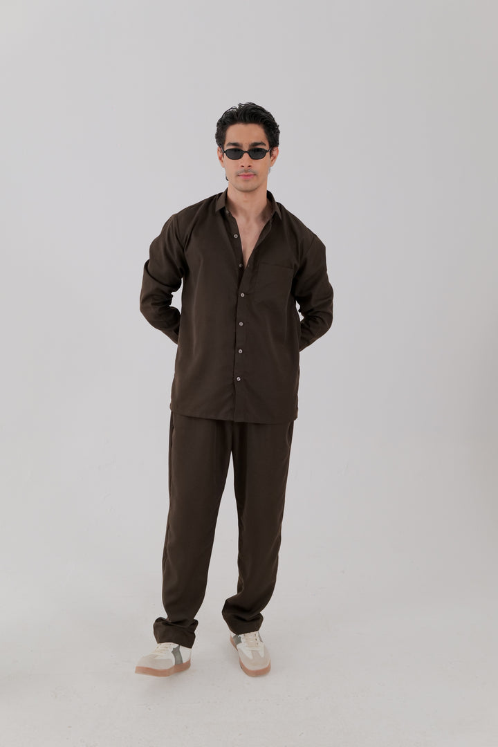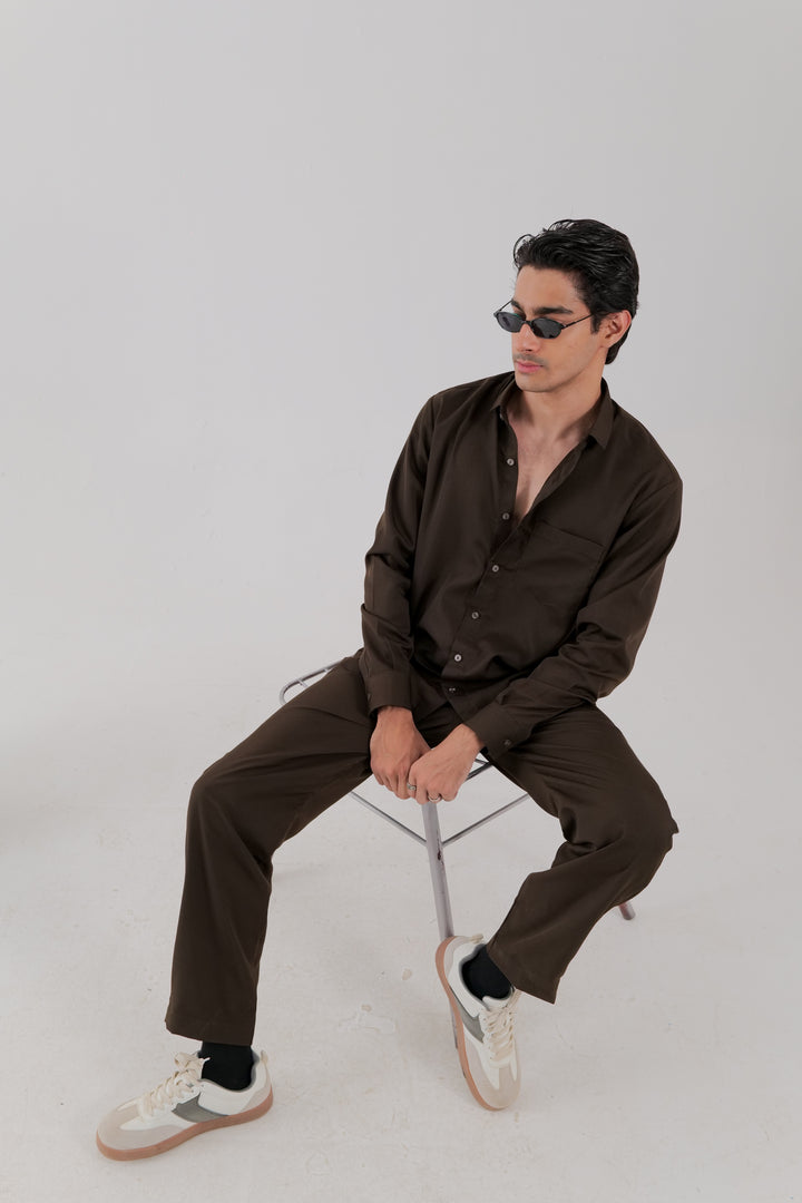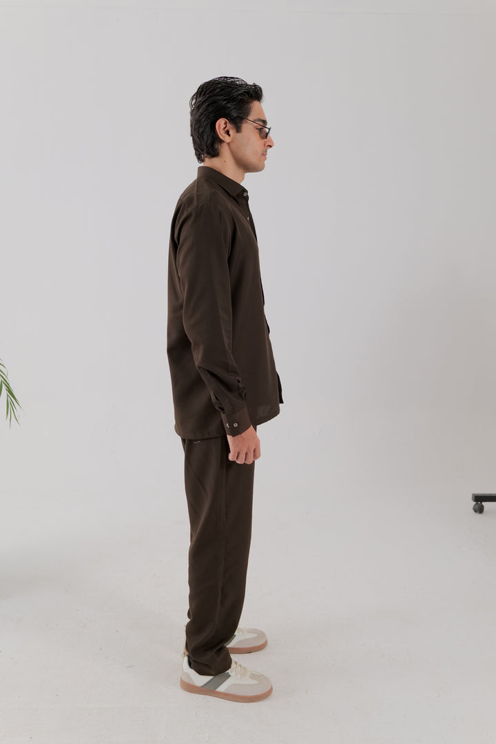A cotton co-ord set in chocolate brown, featuring a shirt with a classic collar, single left chest pocket, full sleeves with cuffs, and a button-down placket. Paired with matching trousers, complete with side pockets for a coordinated, refined look.