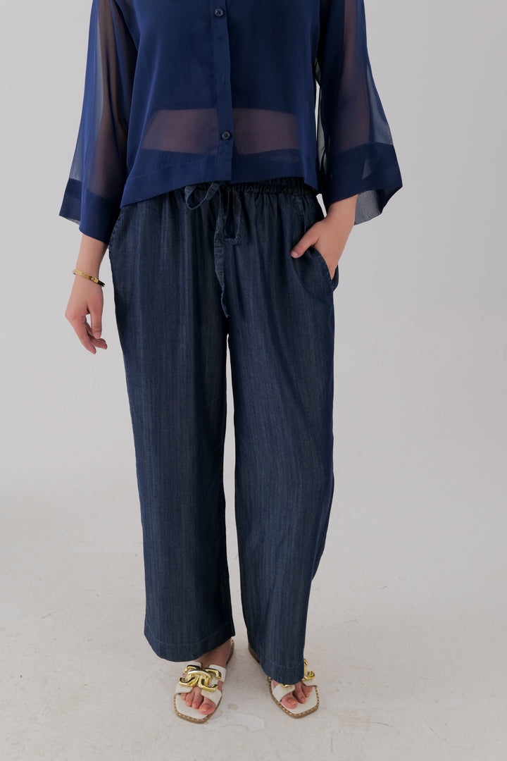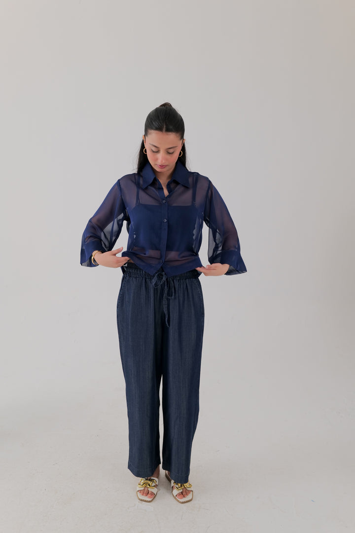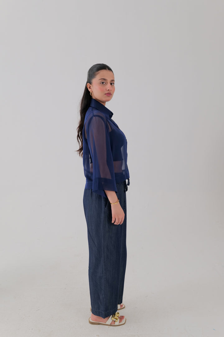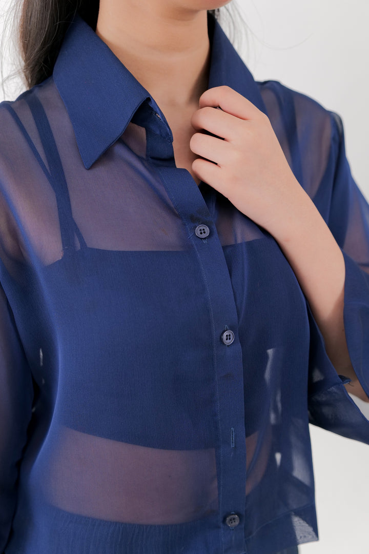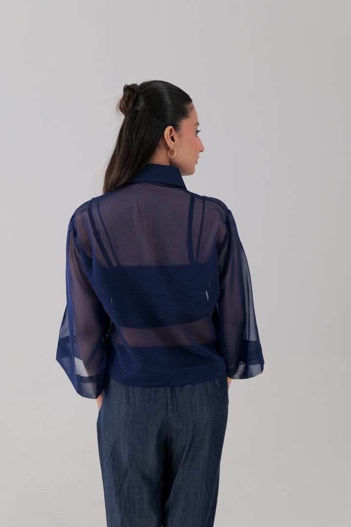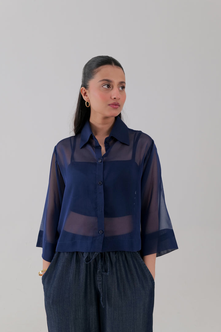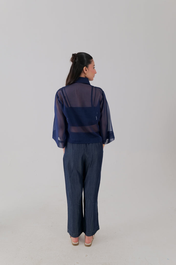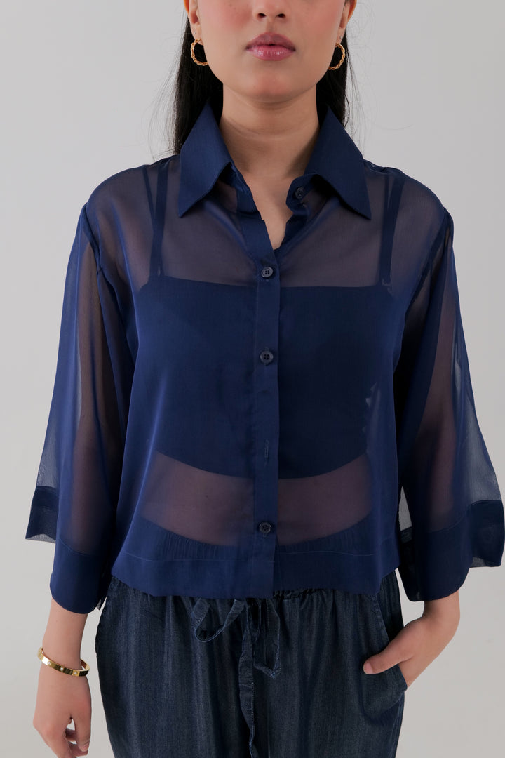 A women’s slightly cropped chiffon button-down shirt in navy blue, designed with a classic shirt collar, 3/4 wide sleeves, and a rounded hem for an effortless, airy silhouette.