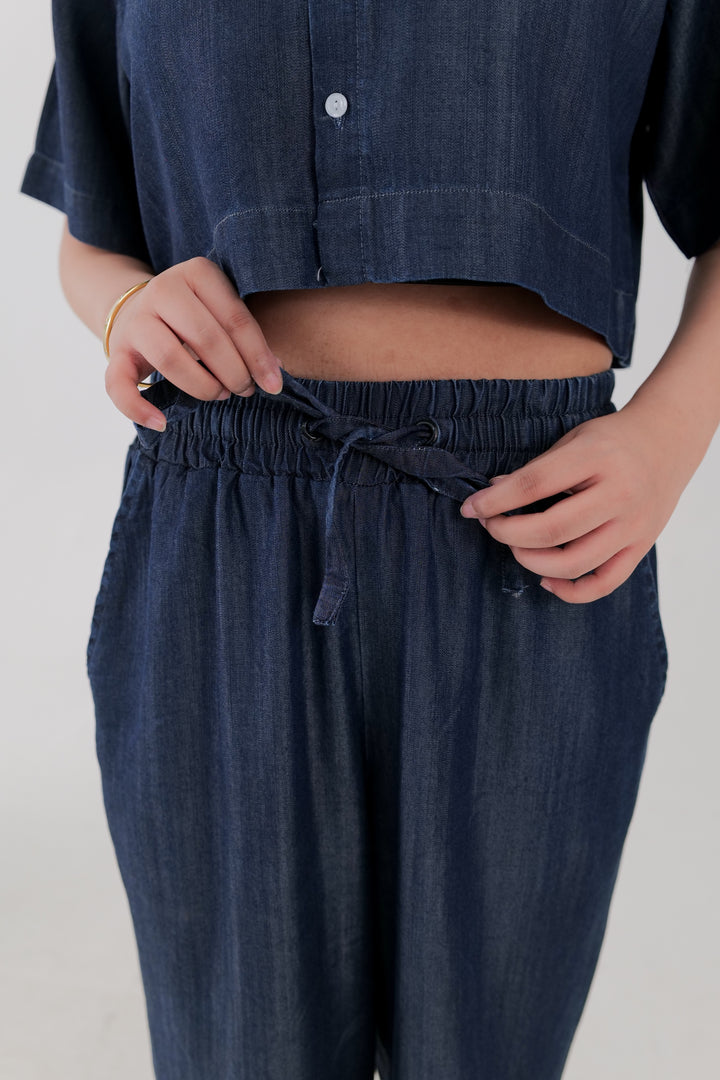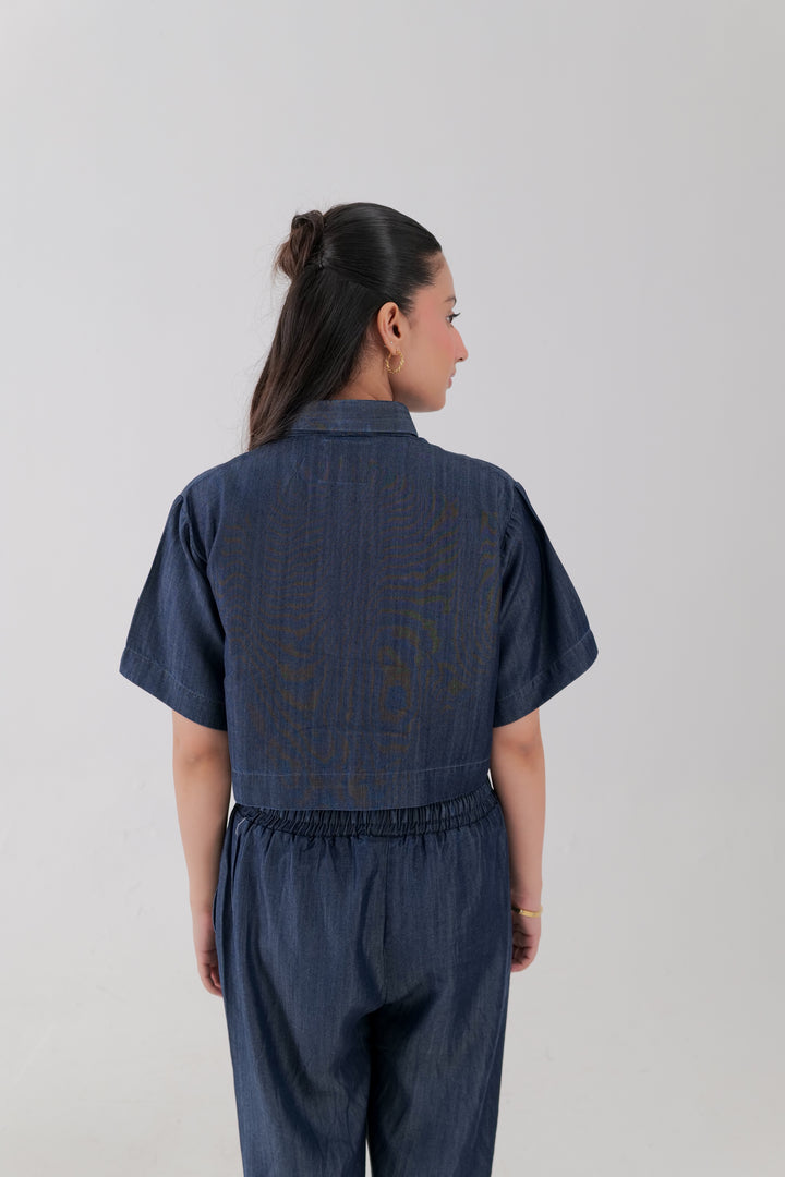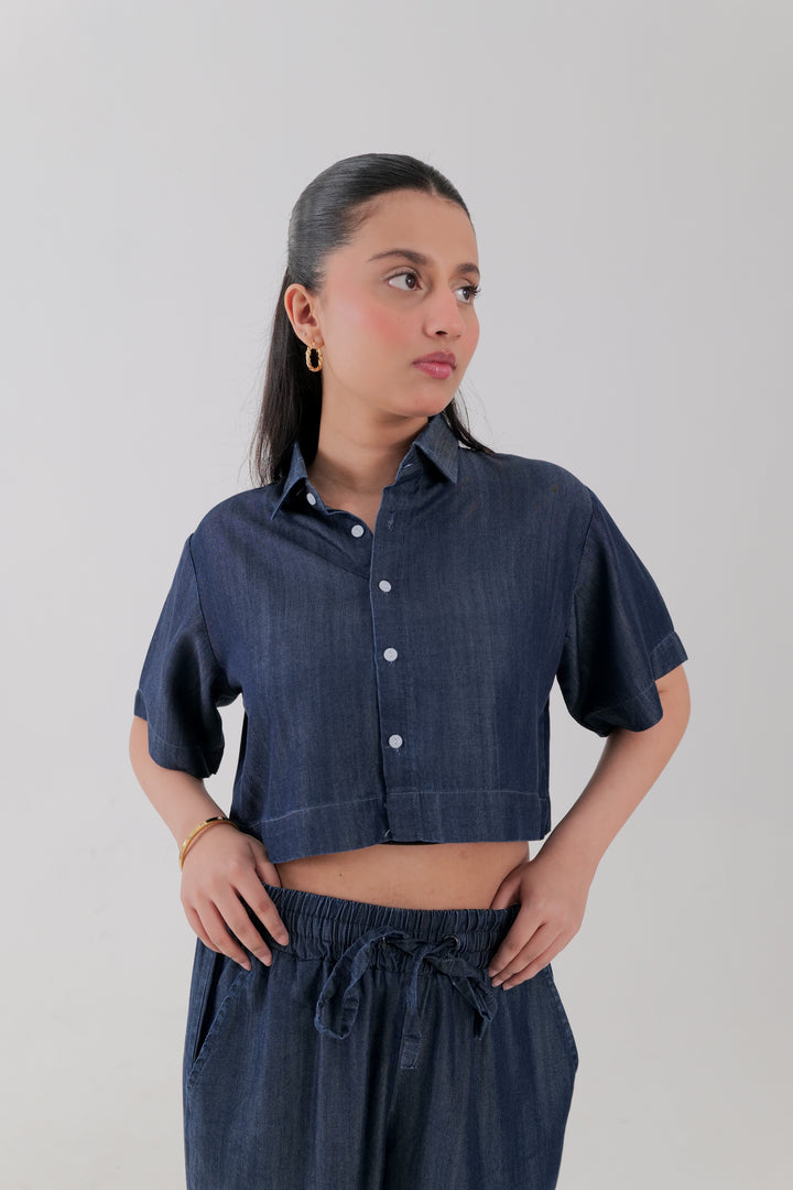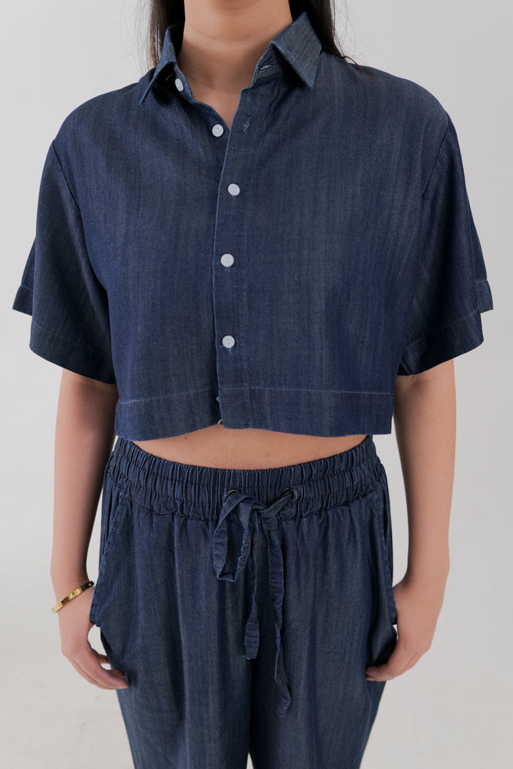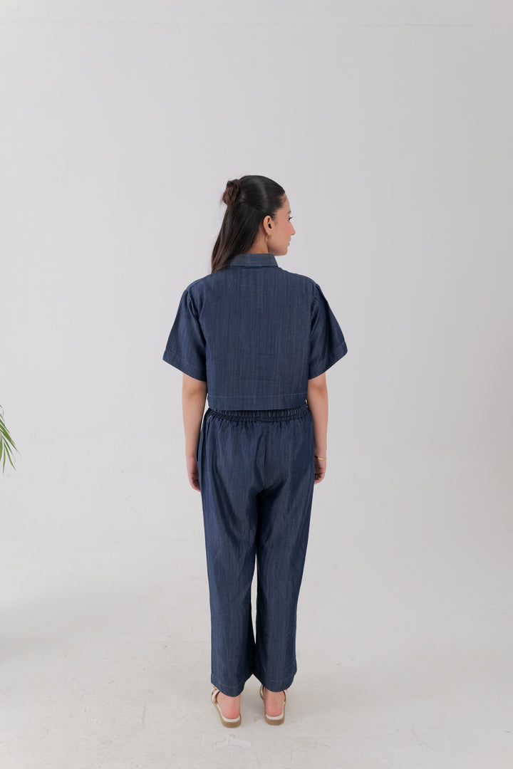 A relaxed-fit denim co-ord set in blue. The shirt is cropped at the waist, featuring a button-down placket, shirt collar, and half loose sleeves. Paired with matching wide-leg pants with side pockets for a laid-back yet refined look.