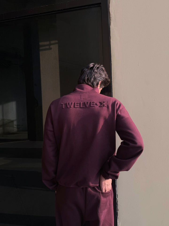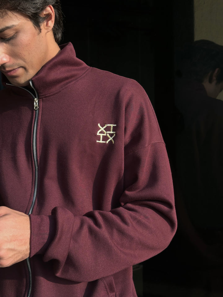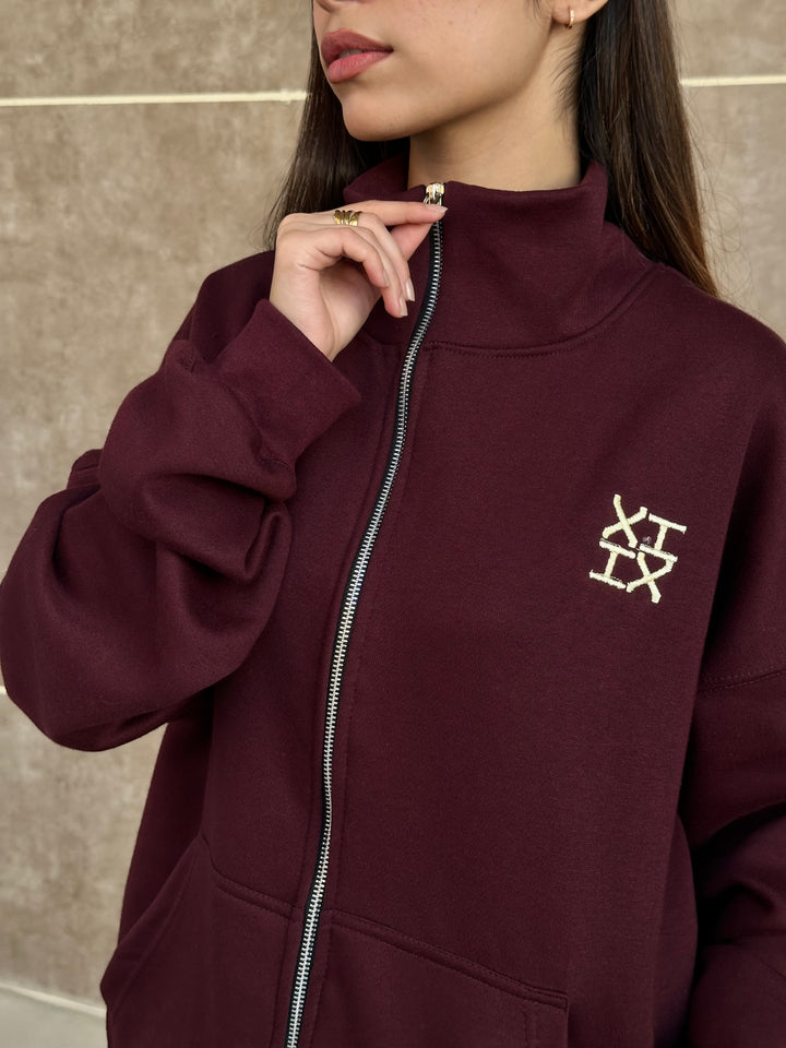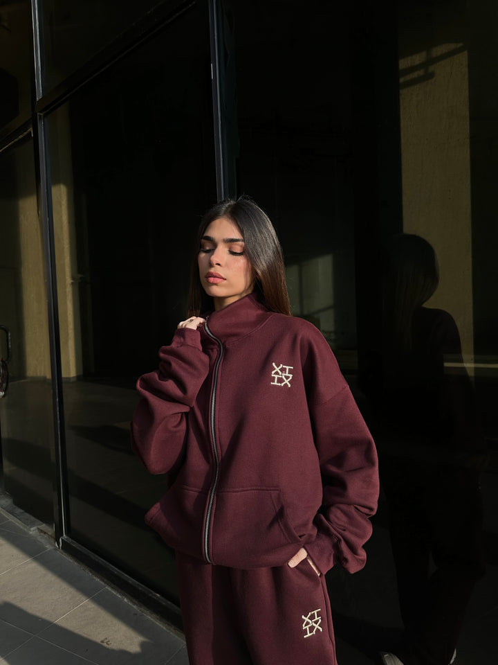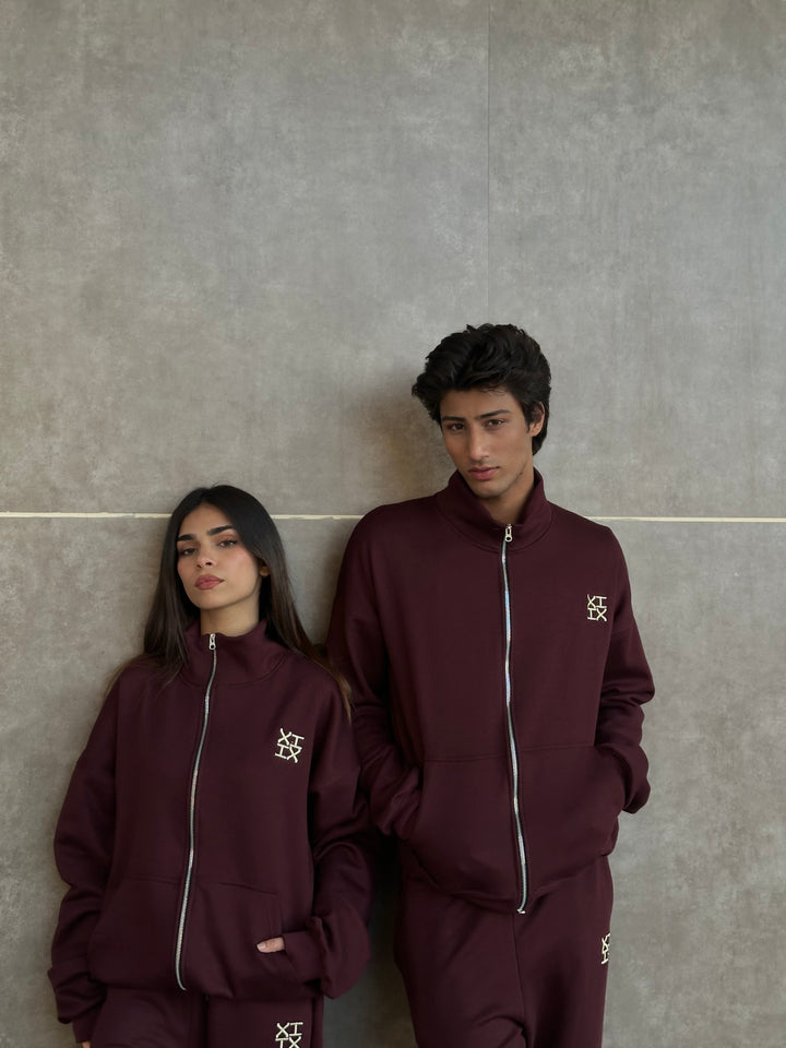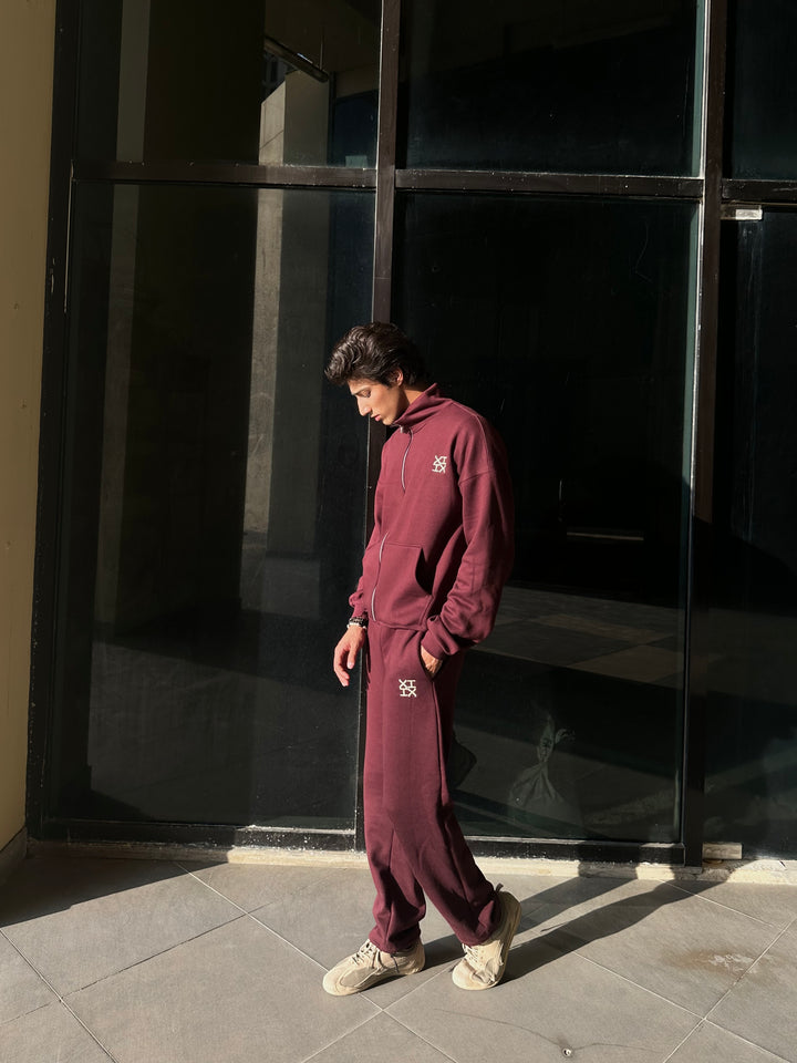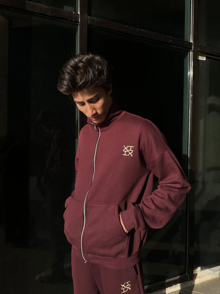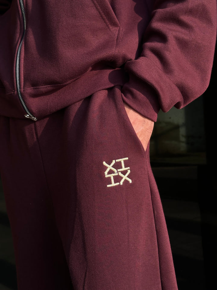 A refined burgundy sweatsuit crafted with a clean silhouette, thoughtful detailing, and a premium hand-feel. Designed in an oversized fit with drop shoulders, the full-zip upper features an off-white embroidered XIIX logo, a spacious kangaroo pocket, and rib finishes that add structure and comfort. The straight-cut trousers offer a relaxed fit with an adjustable hem, a drawstring waist, and matching XIIX embroidery for a cohesive look.