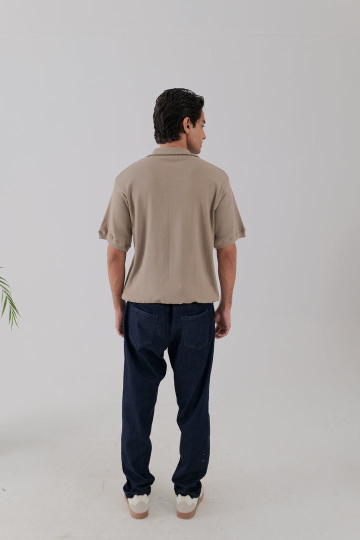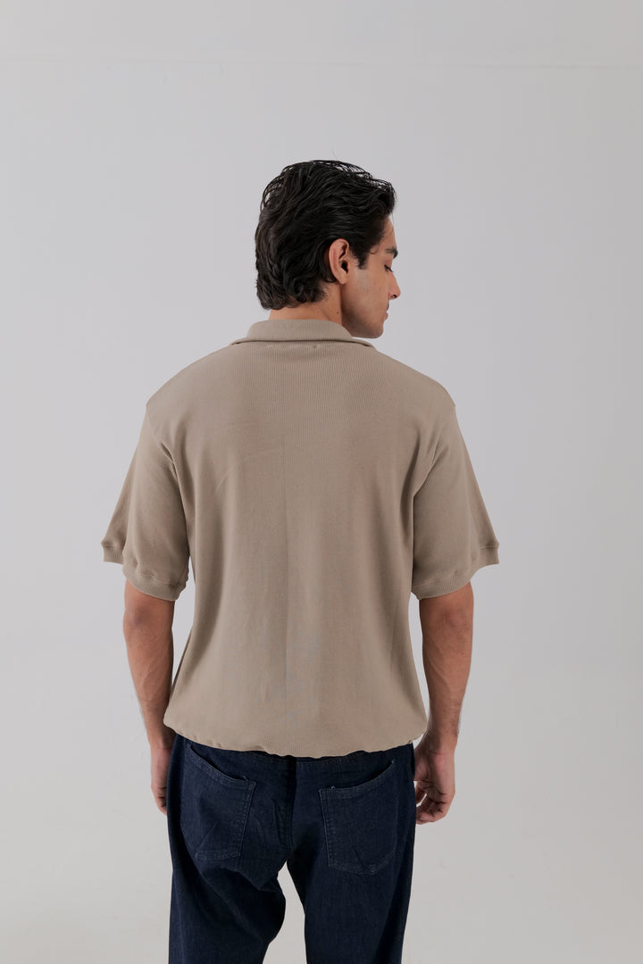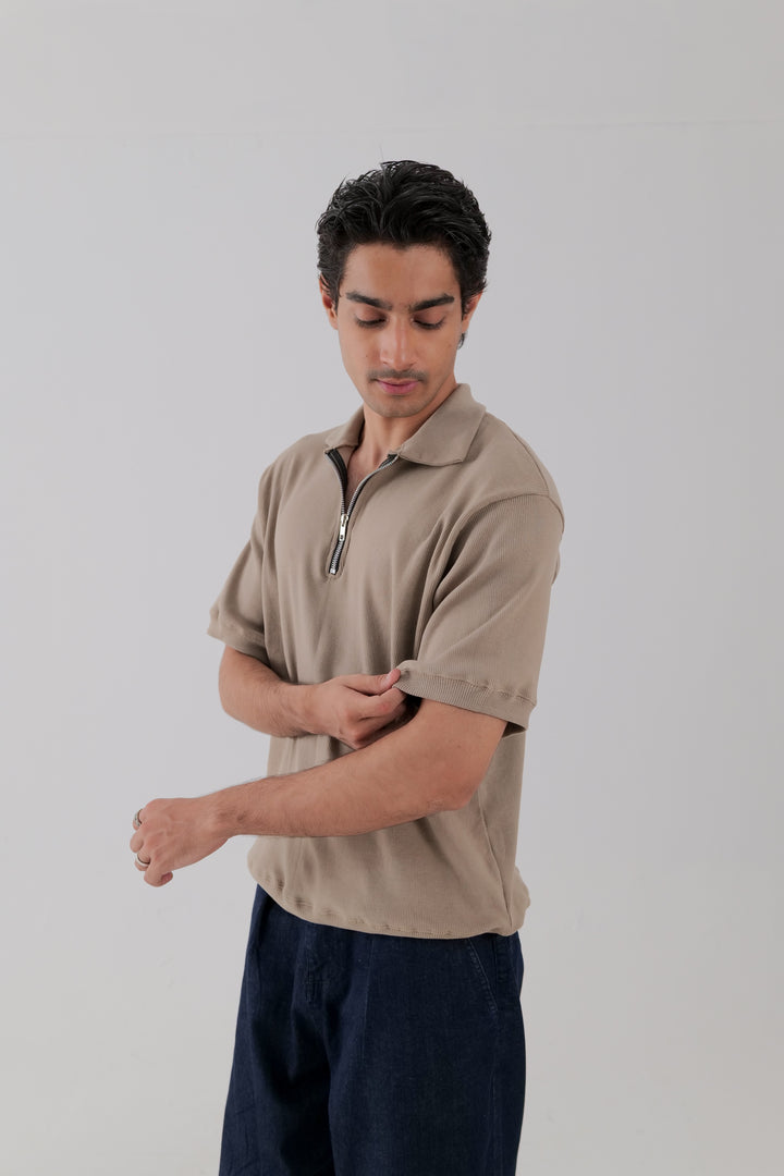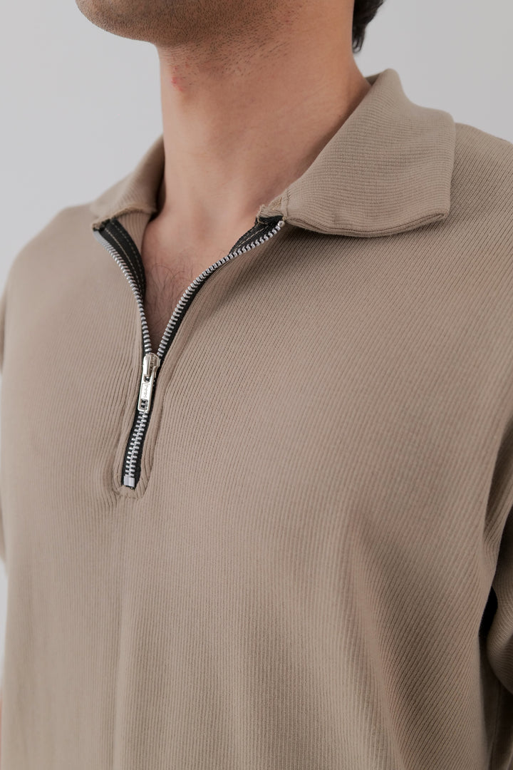 A relaxed half-zip polo in ribbed fabric, designed with a flat collar and slight drop shoulders. Finished in Warm Taupe for a versatile, understated look.