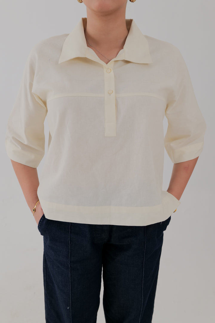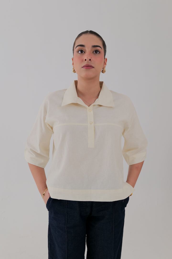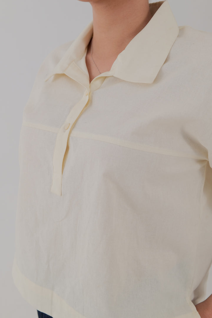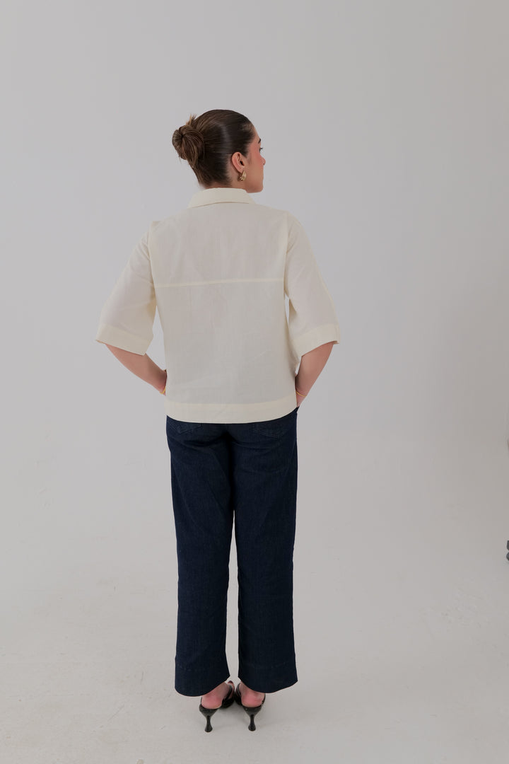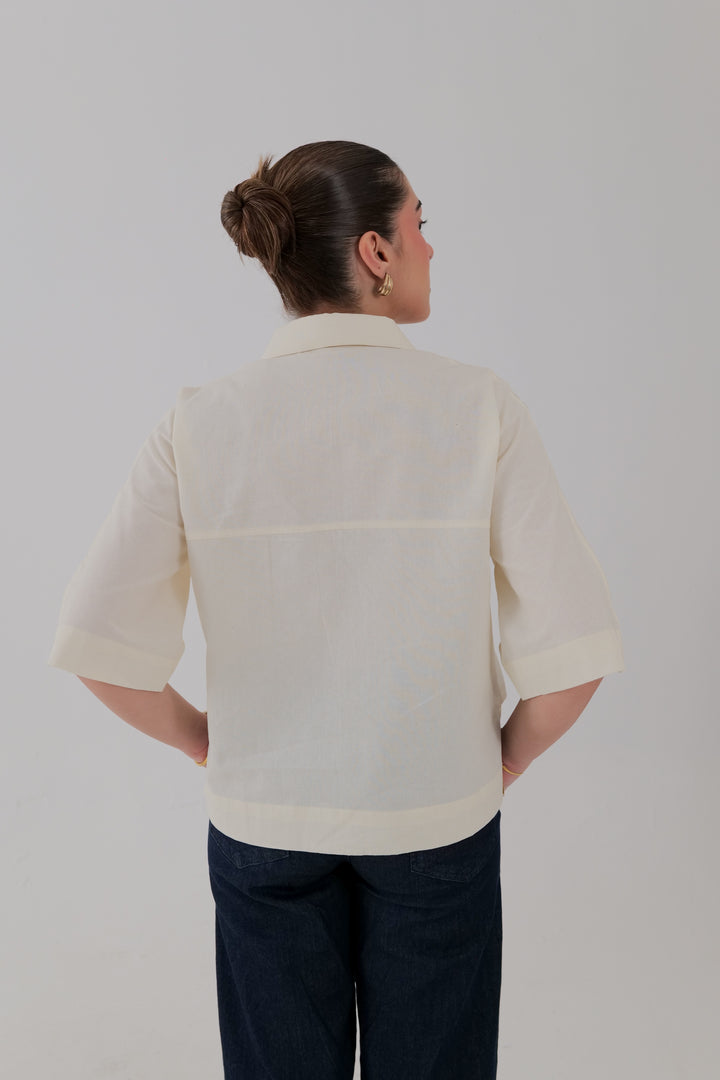 A women’s oversized cotton shirt in ash white, designed with flat collars, a half button placket, and a front panel detail. Features drop shoulders, 3/4 sleeves, and small side slits for relaxed movement.