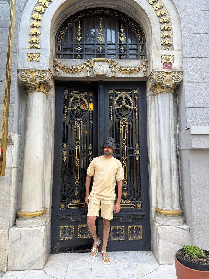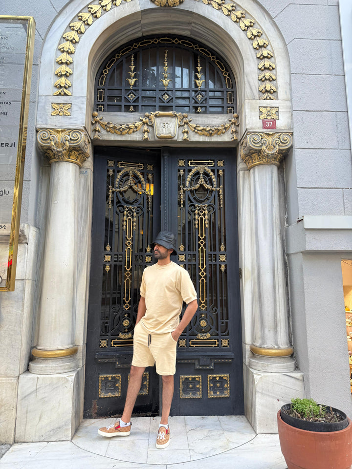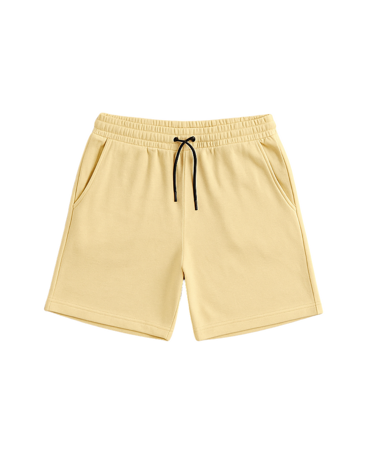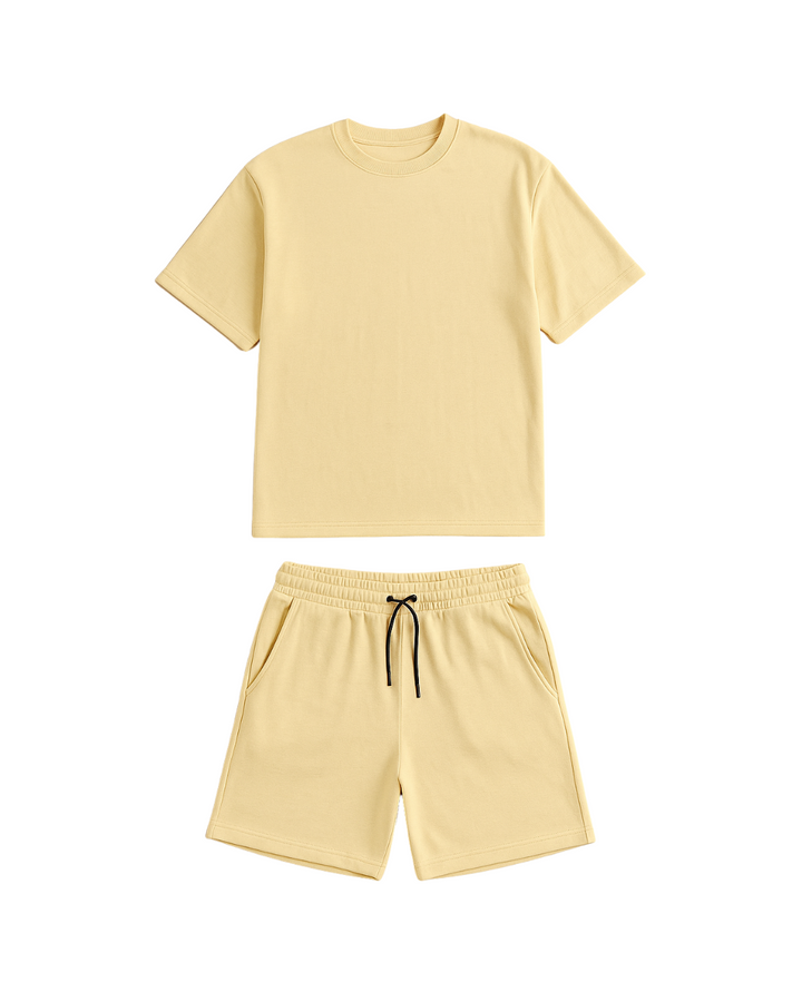 A men’s comfortable-fit co-ord set in soft terry fabric with a smooth finish. The top features a classic crew neckline, paired with matching shorts designed with side pockets and an adjustable drawstring waistband for everyday ease.